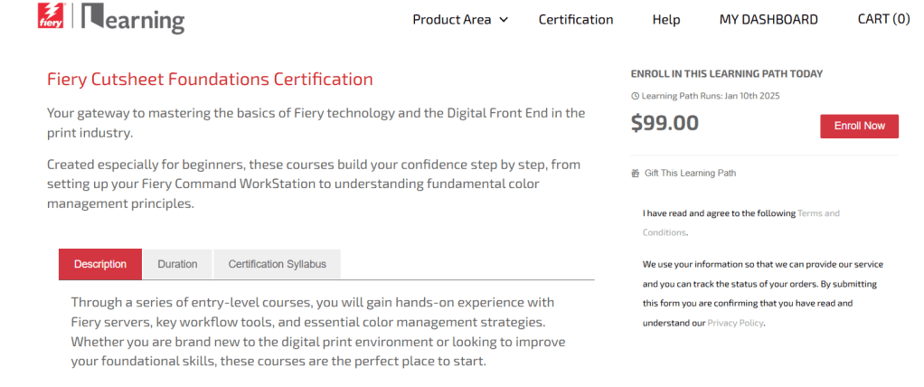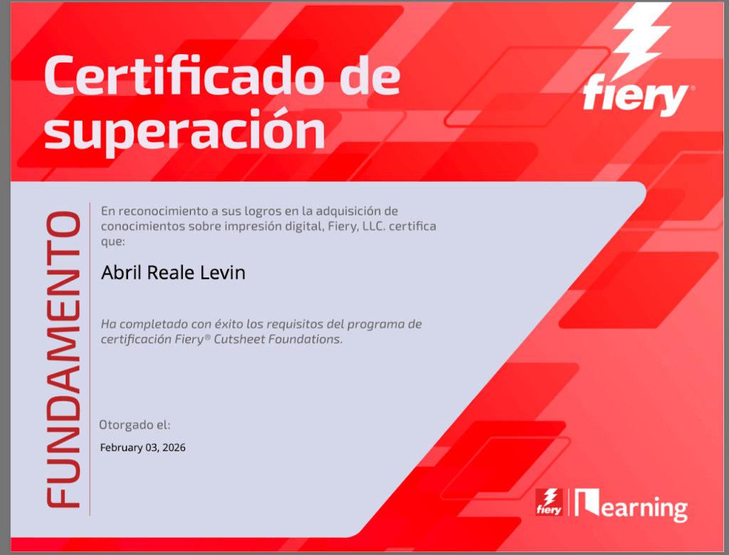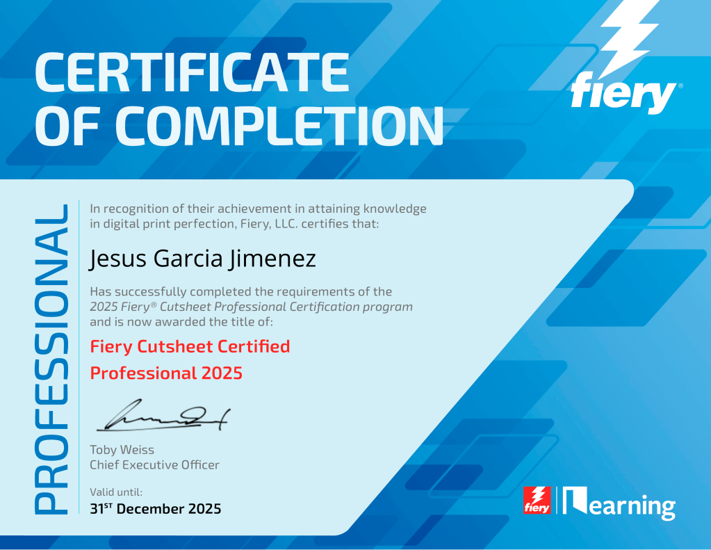 Esta Certificación de alta exigencia y coste elevado, que requiere actualizar la Recertificación continua, profundiza en todos los aspectos de la impresión digital y el manejo de las herramientas disponibles en los servidores Fiery, en nuestro departamento disponemos de un profesor certificado, al menos hasta el 20245, y puede que nos animemos alguno más siempre que nuestras múltiples obligaciones nos lo permitan (que por ganas no es).