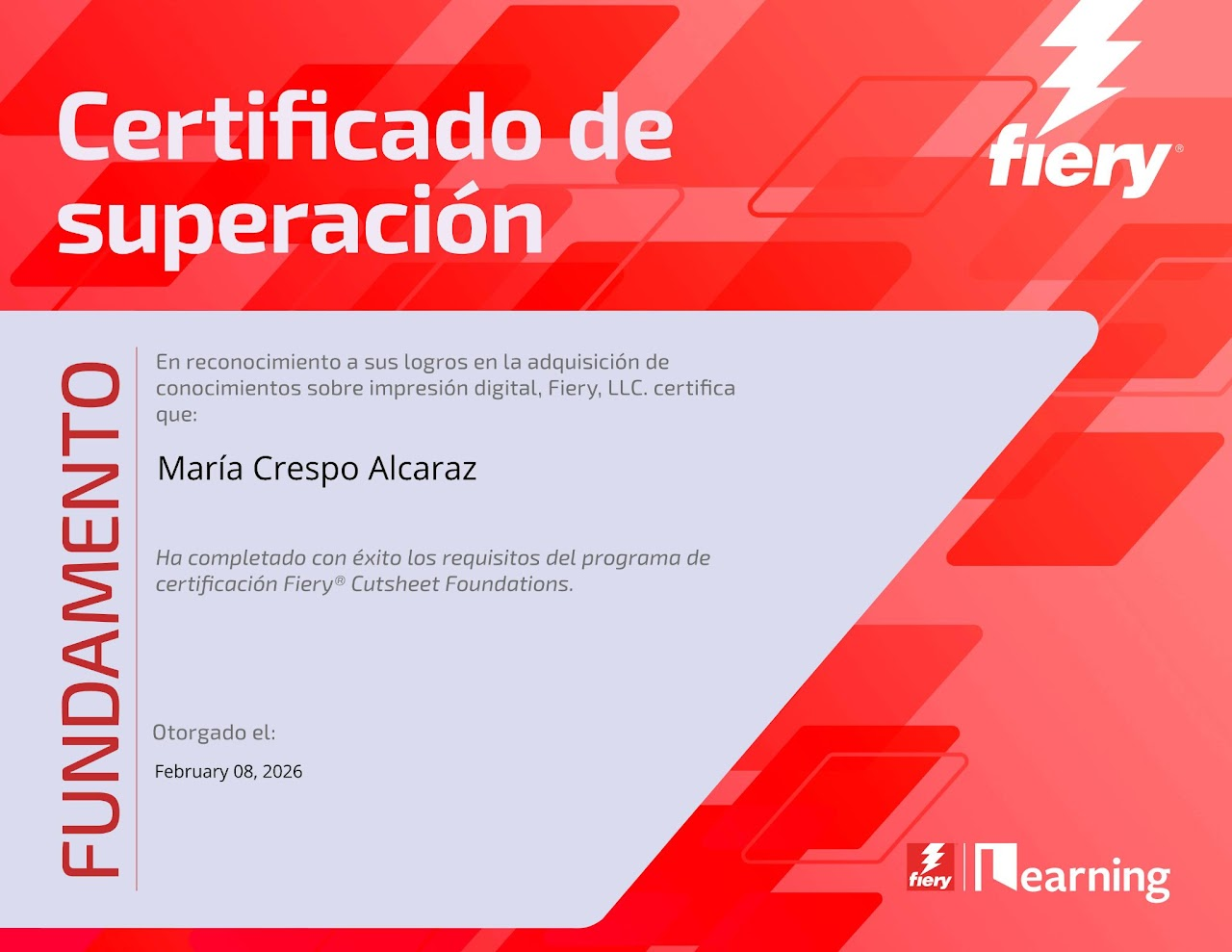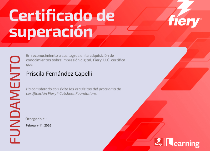 Esta Certificación de alta exigencia y coste elevado, que requiere actualizar la Recertificación continua, profundiza en todos los aspectos de la impresión digital y el manejo de las herramientas disponibles en los servidores Fiery, en nuestro departamento disponemos de un profesor certificado, al menos hasta el 20245, y puede que nos animemos alguno más siempre que nuestras múltiples obligaciones nos lo permitan (que por ganas no es).
